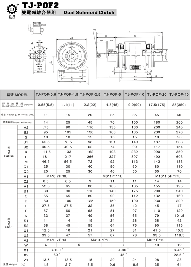 東莞天機傳動(臺灣天機牌)生產廠家銷售的POF2型雙電磁離合器組合體又稱軸式雙電磁離合器組合體,是由兩個電磁離合器組合而成。采用的進口原材料,臺灣生產加工技術,用的是DC24V直流電壓,產品通過ISO9001質量管理體系認證,質量放心可靠,讓客戶購買無憂。該POF2型雙電磁離合器組合體,軸式雙電磁離合器組合體結構非常獨特,安裝也極為簡便。緊湊的貫通軸結構,即兩個電磁離合器都裝置在同軸上,極其的合理配置產著各種部件,是一種極其獨特的組合,適用于正反轉、變速、動力分配、連接、切離、高速運轉等多用途??蓪崿F多種功能,由此機型可實現二級變速、高頻度正反轉等復雜并且高精度的控制等多種功能,同時可以實現傳遞機構的簡單化,安裝和使用都極為簡便,耐用、實用。