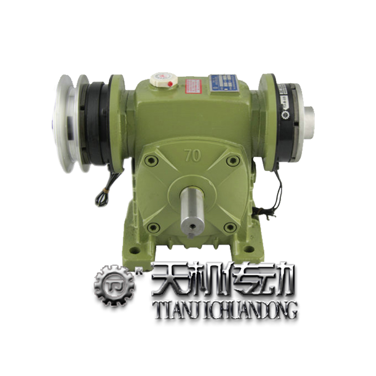 減速機電磁離合剎車器,臥式減速機電磁離合剎車器中心距(型號)50#~100#,傳動比i=10~60。輸出軸朝上,輸入兩端分別裝置DC24V干式單板電磁離合器(附雙槽皮帶輪、單槽皮帶輪等)、干式單板電磁剎車器,電磁離合器一端與驅動三相異步電機(伺服、直流)連接。