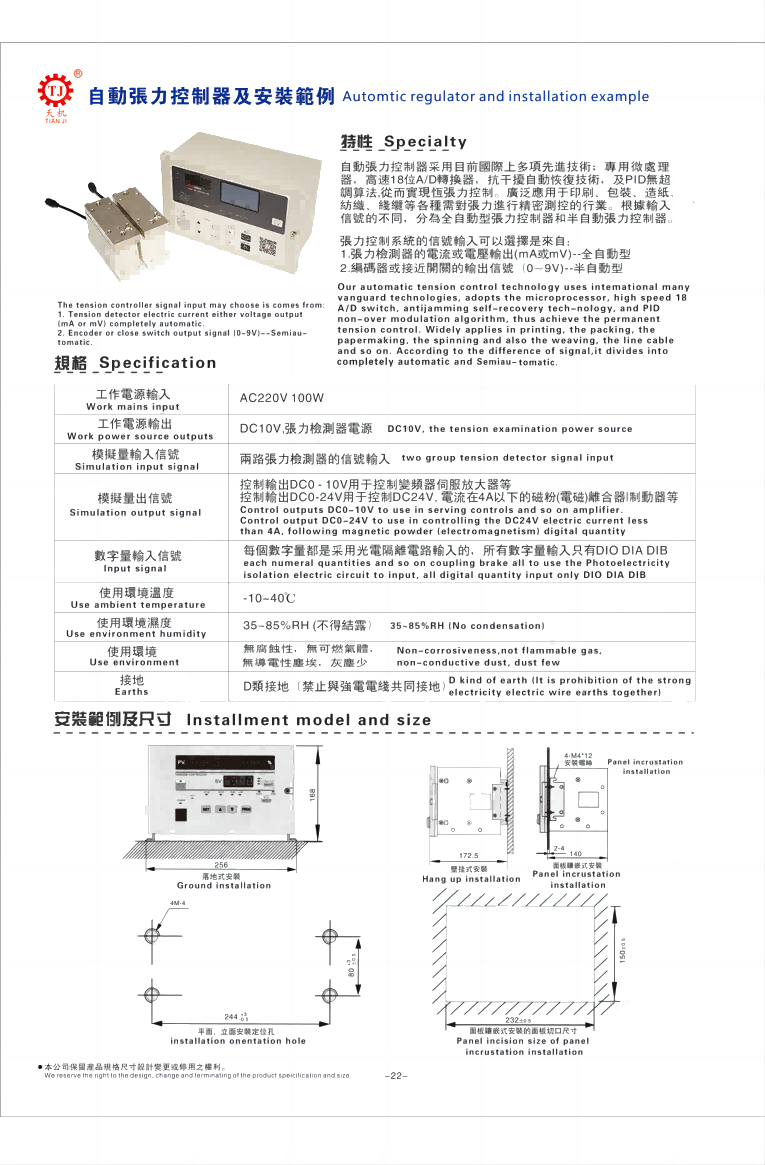 磁粉手動張力控制器,收卷放卷手動張力控制器一般應用于長尺寸材料的收卷、放卷、張力控制系統。在卷徑變化較小的放卷、收卷控制或者中間軸控制時,進行了使用磁粉制動器、磁粉離合器的手動控制(轉矩)。在機械停止時執行緊急控制,或在運轉過程中進行調節旋鈕運程操作。手動張力控制器是依據收料或者出料卷徑的變化,而分階段調整磁粉離合器與磁粉制動器的激磁電流表,從而獲得一致的張力,達到恒定。同類產品還有全自動張力控制器,該型張力控制器在技術上是比較先進,可省時間、省人工。由于使用了張力檢測器的閉環式張力控制器,根據外部順控程序進行多軸切換控制時基于輥筒切換輸入信號執行控制輸出的新軸預置控制,此類型張力控制器必須在外部執行預驅動控制。手動張力控制器安裝方式有落地式安裝、壁掛式安裝、面板鑲嵌式安裝三種常見的。